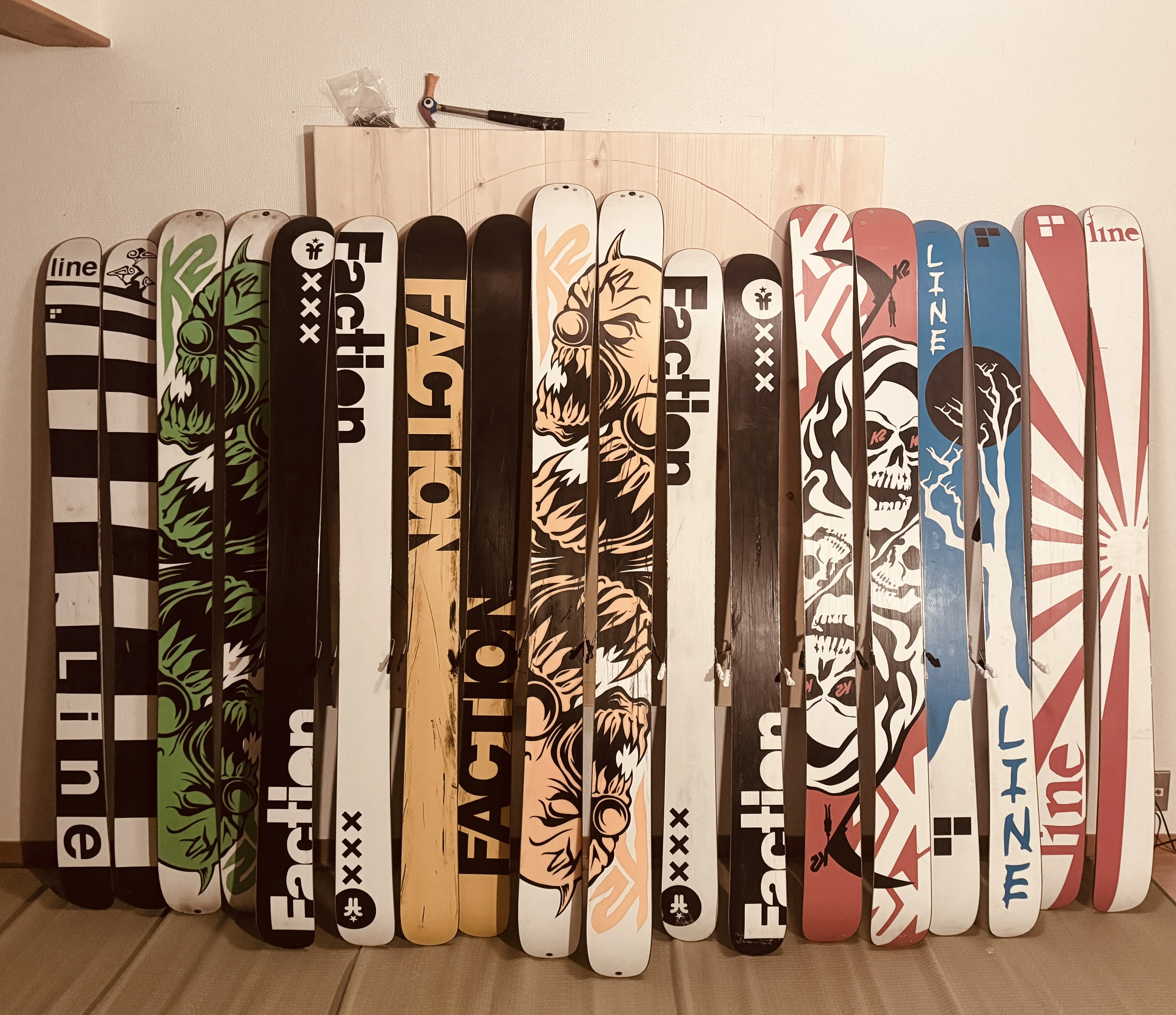 The skis tell you the rest of what you need to know about why we're here. We keep a collection: K2 Hellbents, Faction Royales, Line EP Pros, Line Bacons, fat pow skis, most of them designed with Japan in mind, artistically and in shape. That feels right. The collection grows one ski bag trip at a time, gathered from skis scattered across the world. Not demos in the usual sense. Tools that still work, built for deep snow and a different approach to the whole thing.